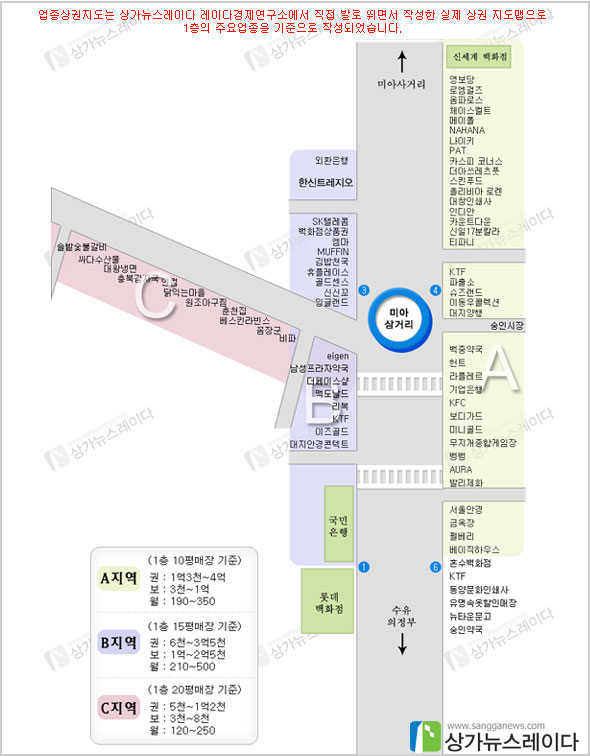 ¹Ì¾Æ»ï°Å¸®¿ª»ó±ÇÀº ÁöÇÏö4È£¼±ÀÌ ¿îÇàÇÏ´Â ¹æÇâÀÎ ¡®¹Ì¾Æ·Î¡¯, ¡®µµºÀ·Î¡¯¿Í ¡®Á¾¾Ï·Î¡¯,¡®¿ù°è·Î¡¯°¡ ±³Â÷ÇÏ´Â ¹Ì¾Æ»ç°Å¸®¿¡¼ ºÏÂʹæÇâÀ¸·Î µµºÀ·Î¸¦ ³¢°í 700m°¡·® À̾îÁø´Ù. ±×¸®°í ¹Ì¾Æ»ï°Å¸®»ó±ÇÀÇ Áß½ÉÀÎ ¼þÀνÃÀå¾Õ µµºÀ·Î´ë·Îº¯¿¡ ÁöÇÏö4È£¼± ¹Ì¾Æ»ï°Å¸®¿ªÀÌ À§Ä¡ÇØ ÀÖ´Ù. »ó±ÇÀÌ ÇÑÂÊÀ¸·Î Ä¡¿ìÄ¡Áö ¾Ê°í 8Â÷¼±´ë·Îº¯ ¾çÂÊÀ¸·Î ¸¶ÁÖº¸¸ç À§Ä¡ÇØ ÀÖÁö¸¸ Æ®·¹Áö¿À,·Ôµ¥¹éÈÁ¡ µî °ø»çÁßÀÎ °Ç¹°ÀÌ ¸¹Àº 1,2,3¹øÃⱸÂʺ¸´Ù´Â ½Å¼¼°è¹éÈÁ¡¿¡¼ ¼þÀνÃÀåÀ» °ÅÃÄ °í·Á»õÇѺ´¿ø¿¡ À̸£´Â 4,5,6¹øÃⱸ¾Õ »ó±ÇÀÌ À¯µ¿Àα¸³ª ¼ÒºñÁý°´·Â¿¡ ÀÖ¾î¼ ÇöÀç±îÁö´Â ¸ÂÀºÆíº¸´Ù ´Ù¼Ò ¾Õ¼´Â °ÍÀ¸·Î ºÐ¼®µÈ´Ù.